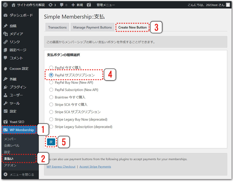 ダッシュボードに「WP Membership」が追加されSimple Membershipが使用可能になる